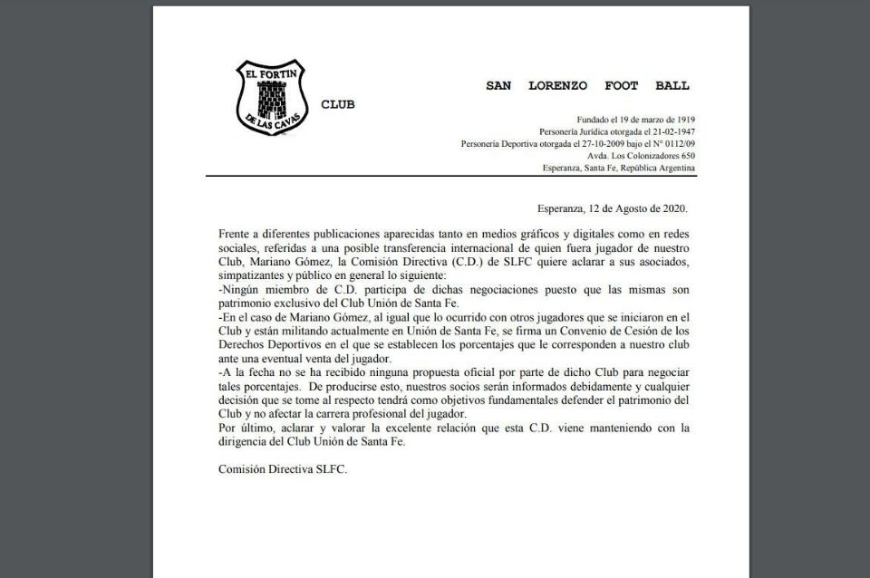 El mismo arranca de la siguiente manera: "Frente a diferentes publicaciones aparecidas tanto en medios gráficos y digitales como en redes sociales, referidas a una posible transferencia internacional de quien fuera jugador de nuestro Club, Mariano Gómez, la Comisión Directiva (C.D.) de SLFC quiere aclarar a sus asociados, simpatizantes y público en general lo siguiente".