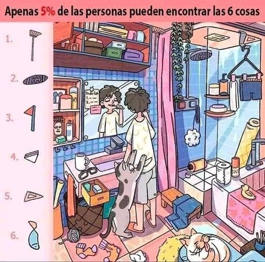 La imagen completa está conformada por decenas de artículos en donde se esconden específicamente 5 objetos que te mostramos a continuación; el reto está en encontrar estos 5 objetos en la imagen donde también aparecen dos gatos , ¿lo lograrás?