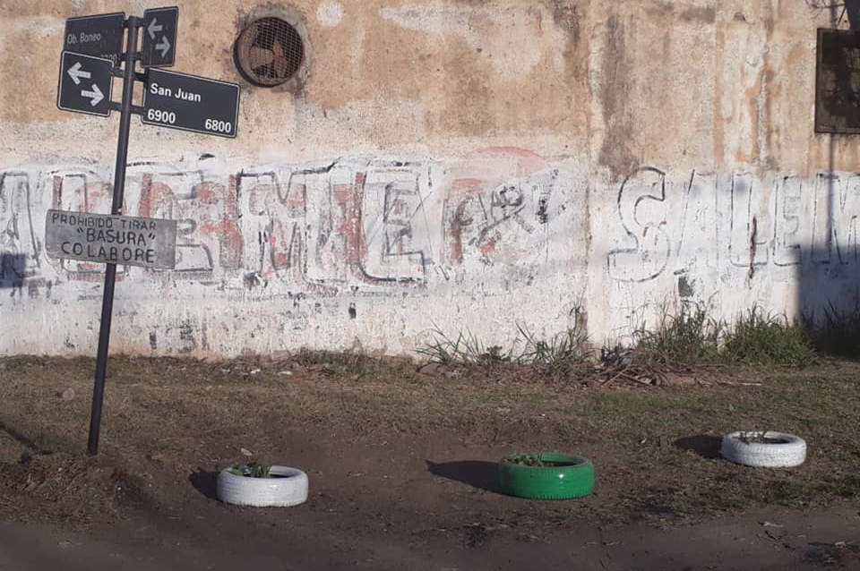 Colocaron tres cubiertas de auto en desuso, las pintaron y las transformaron en un cantero para plantas. Además, colocaron un cartel para concientizar.