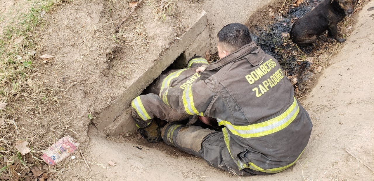 El hecho sucedió esta mañana, cuando los efectivos acudieron a la intersección de las calles J.J. Paso y Tucumán. Allí, un vecino les manifestó que un animal había derrapado en la cloaca y estaba atrapado en su interior.