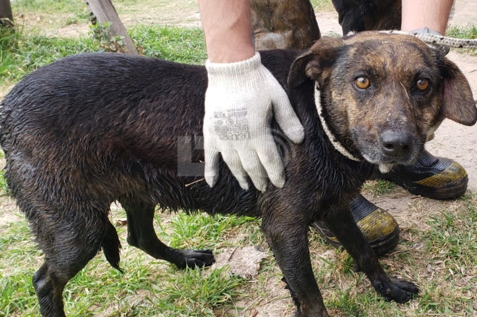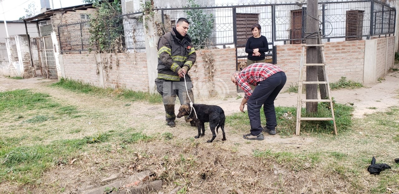 Bomberos del cuartel de la ciudad de Santo Tomé rescataron a un perro que se había caído a una profunda alcantarilla.