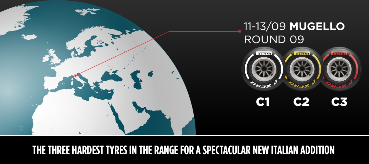Pirelli será el patrocinador principal del primer Gran Premio en Mugello, que también celebra 1000 carreras para Ferrari. Se han elegido los tres neumáticos más duros de la gama: C1 como blanco duro, C2 como amarillo medio y C3 como rojo blando.