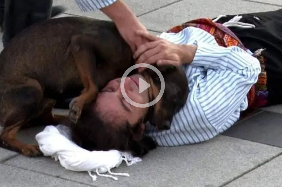 Sin embargo, cuando el actor se queda en el suelo inmóvil no pudo continuar con su interpretación porque un perro callejero se dirigió directamente hacia el hombre y comenzó a animarlo al recostarse sobre su cuello.
