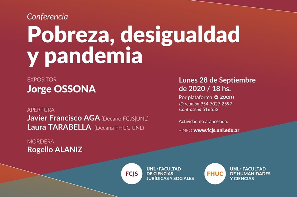 Se realizará la conferencia denominada: Pobreza, desigualdad y pandemia, el lunes 28 de septiembre a las 18. La exposición estará a cargo de Jorge Ossona. La apertura contará con la presencia de Javier Aga (decano de la FCJS) y Laura Tarabella (decana de la Facultad de Humanidades y Ciencias) y estará moderado por Rogelio Alaniz.