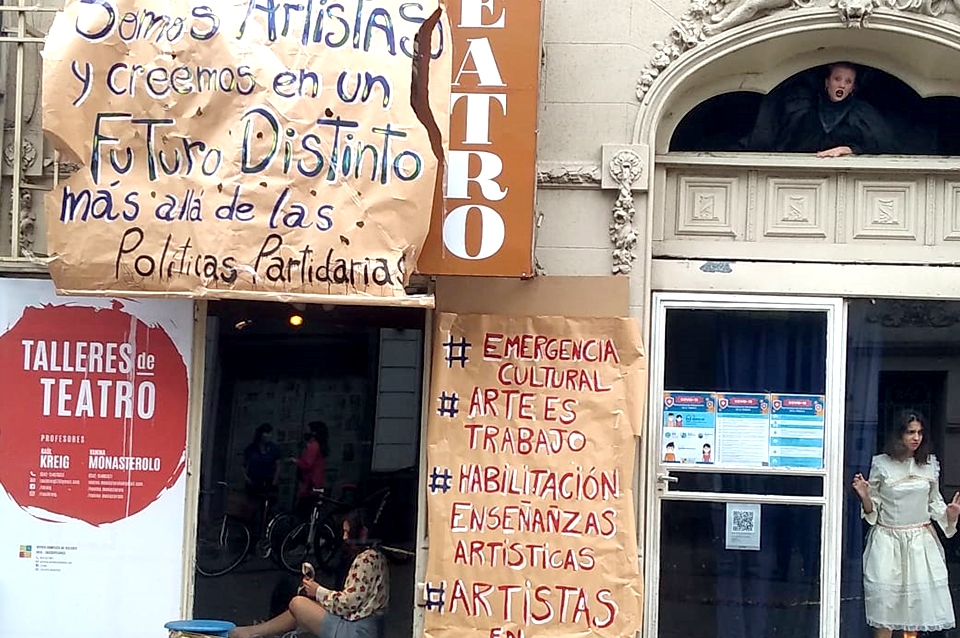 Trabajadores de la cultura realizaron en la tarde de este viernes una intervención en una sala independiente de la ciudad en reclamo por el cierre de actividades en la ciudad y la región por la pandemia de coronavirus.