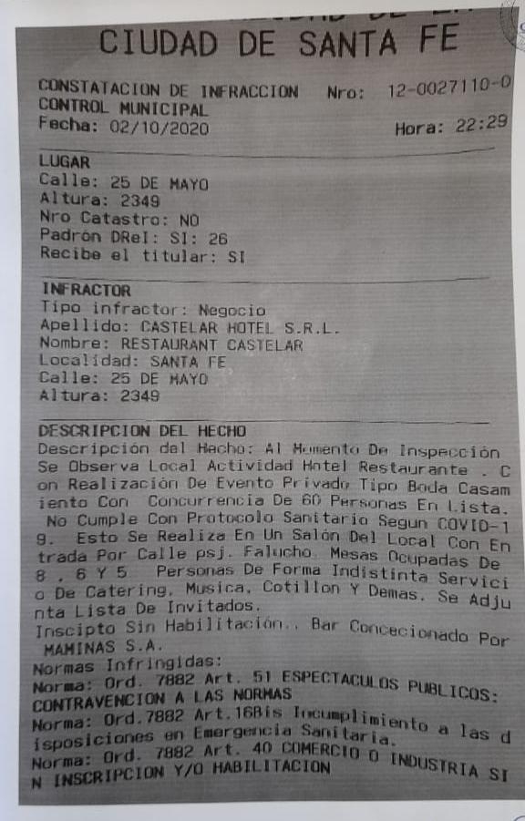 Luciano Cadoche, encargo del restaurante del Hotel Castelar, sostuvo por LT10 que “estamos muy tristes y enojados con lo que publicaron varios medios. Nosotros no hicimos nada ilegal, ni clandestino (tenemos ventanales traslúcidos). Nosotros ofrecimos una cena para dos jóvenes que se casaron y cumplimos con todos los protocolos (4 personas por mesa)”.