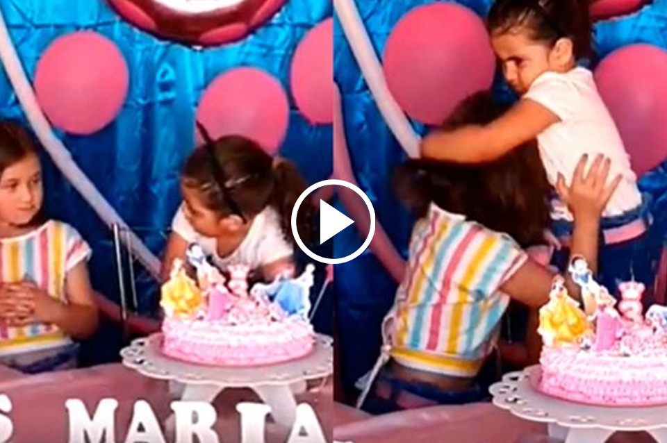 Minutos después, la pequeñita estaba a punto de apagar la vela de su pastel cuando su hermana mayor sopla primero y la apaga.