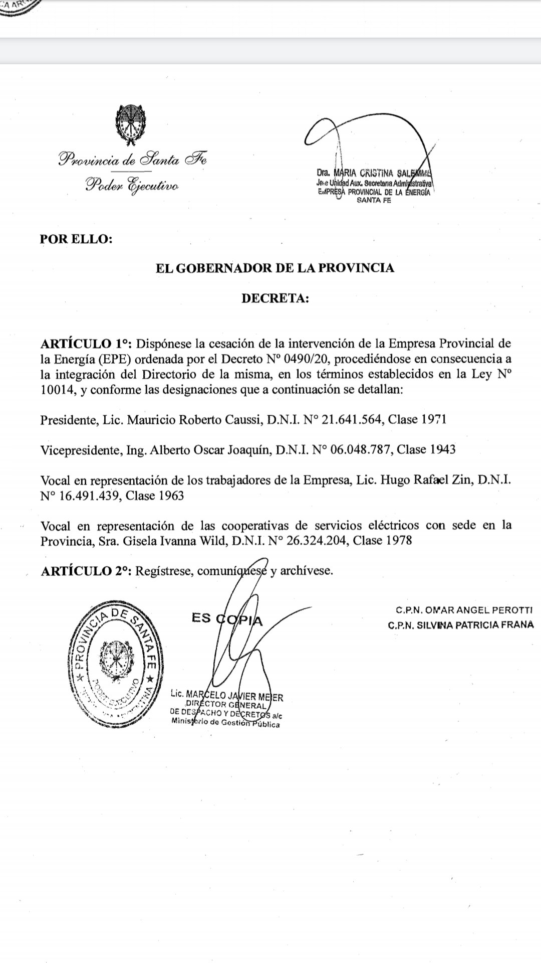 El nuevo decreto, rubricado este lunes por Perotti y por la ministra de Infraestructura Silvina Frana, le pone fin a la intervención y dispone además la integración del nuevo directorio de la EPE: Caussi y Joaquín fueron nombrados presidente y vice; Hugo Rafael Zin asumirá como vocal en representación de los trabajadores de la empresa y Gisela Ivanna Wild será vocal en representación de las cooperativas de servicios eléctricos.