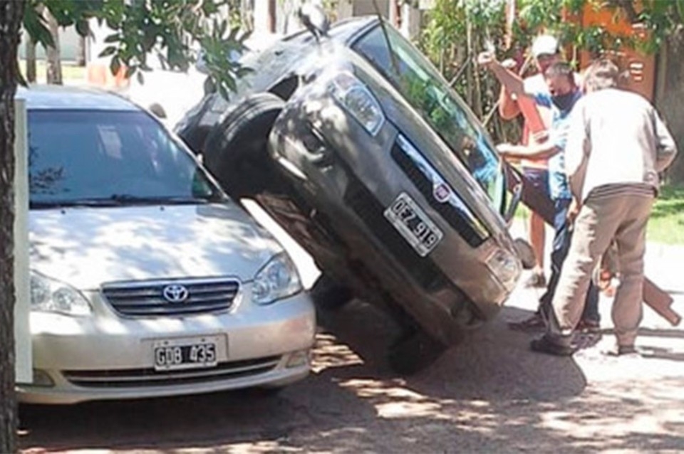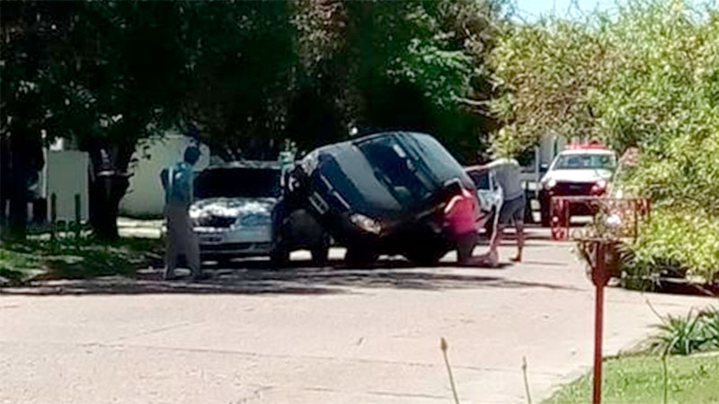 Un impresionante accidente ocurrió esta mañana en la zona céntrica de Urdinarrain, en Entre Ríos. Un automóvil Fiat que era guiado por un reconocido meteorólogo de la región, llamado Eduardo Aubert, chocó contra un Toyota que estaba estacionado. El Fiat del profesional quedó sobre dos ruedas y "montado" sobre el otro vehículo.