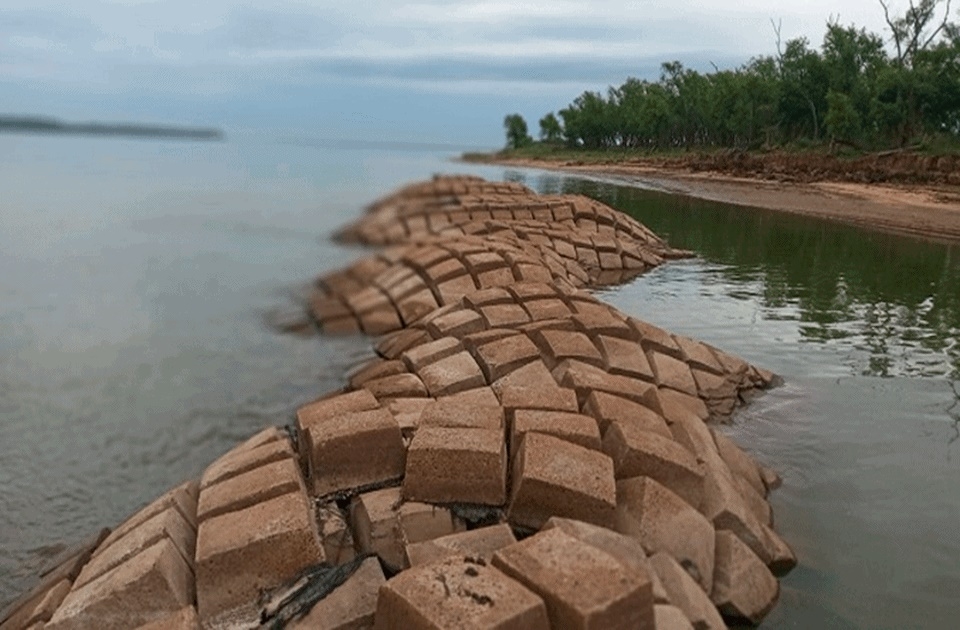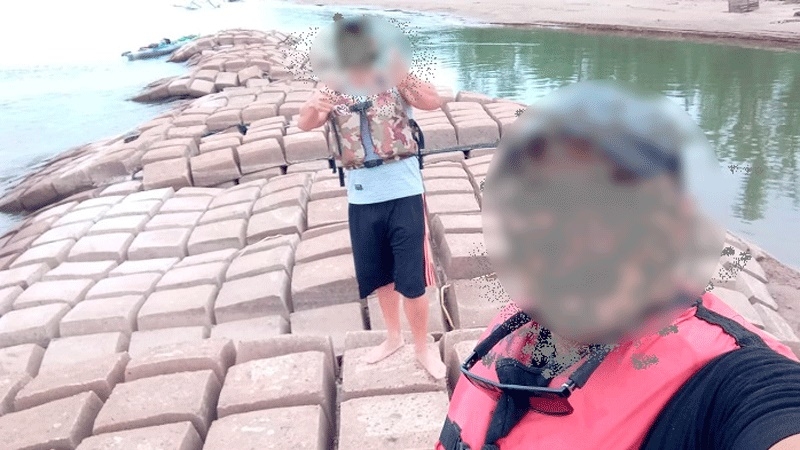 Este domingo, kayakistas aficionados llegaron hasta el lugar y fotografiaron la manta geotextil que fue colocada para resguardar la integridad de la infraestructura del enlace que comunica la provincia de Entre Ríos y Santa Fe.