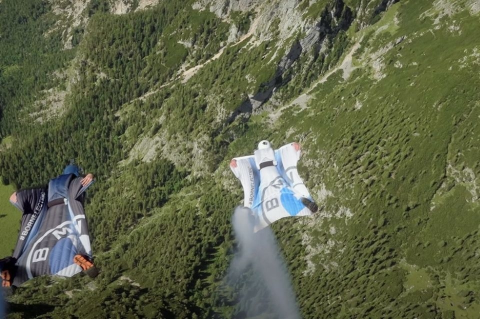 Salzmann comenzó el vuelo junto a dos compañeros, que usaron un traje sin motor. Tras saltar desde el helicóptero a una altura de 3.000 metros, los tres deportistas formaron un grupo volando rumbo a las montañas en Austria.