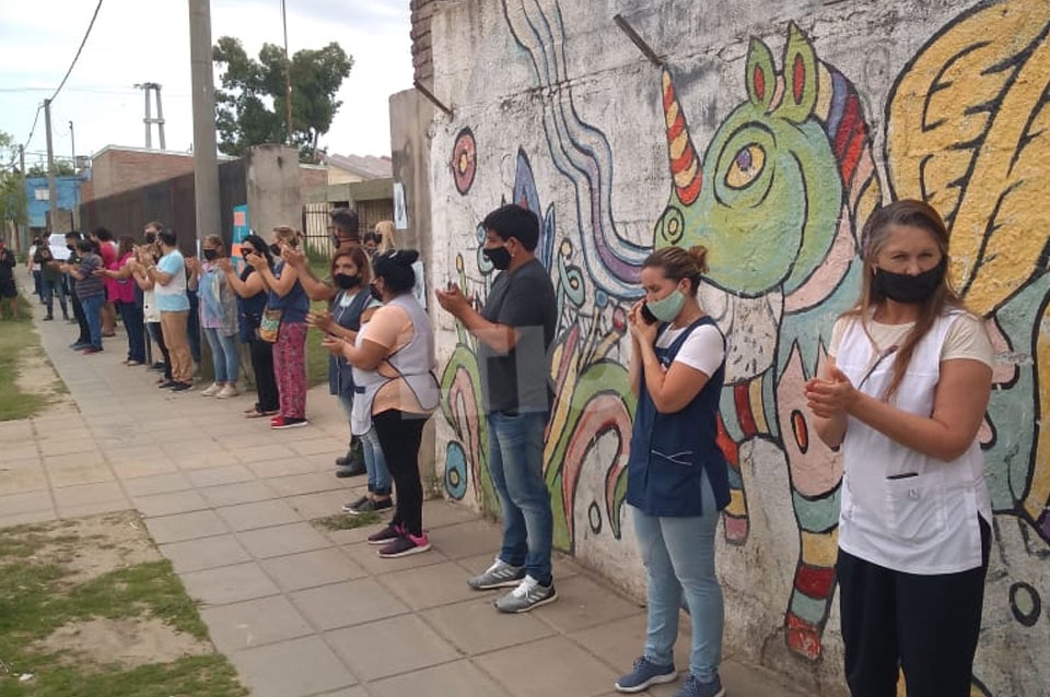 Más de 60 vecinos se congregaron en calle Naciones Unidas y Aguado, en barrio Santa Rosa de Lima para realizar un abrazo simbólico a la Escuela Nro 1111 Luis Borruat, el blanco de la delincuencia en estos meses de pandemia.