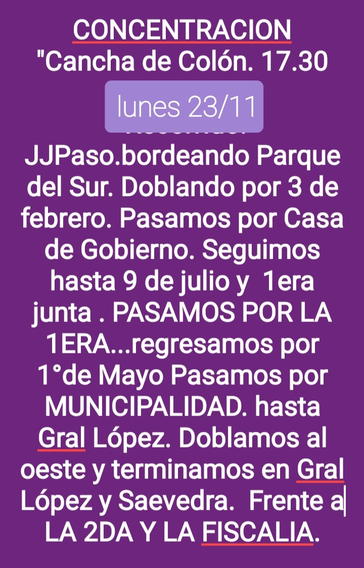 Por ello, decidieron hacer "un abrazo simbólico con los autos", que partirá a las 17:30 de la cancha de Colón, bordeará el Parque del Sur, pasará por Casa de Gobierno, por el Ministerio de Seguridad y por la comisaría 1era, para luego regresar hacia la Municipalidad y terminar en la esquina de Saavedra y General López, donde están la Fiscalía Regional y la comisaría 2da.