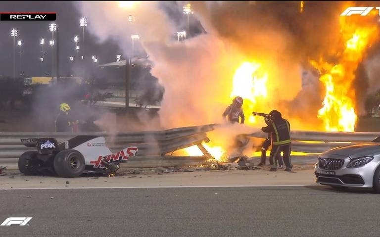 Grosjean ha sido víctima de un fortísimo accidente segundos tras la salida de la carrera de Baréin. El piloto francés salía desde la 19ª posición y se ha ido contra los guardarraíles en la primera vuelta, tras un toque con Daniil Kvyat. El impacto generó una gran bola de fuego que hizo a la FIA detener la carrera de inmediato.