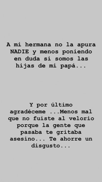 Luego defendió a Gianinna: "A mi hermana no la apura nadie y menos poniendo en duda si somos hijas de mi papá. Y por último, agradeceme. Menos mal que no fuiste al velorio porque la gente que pasaba te gritaba asesino. Te ahorré un disguto".