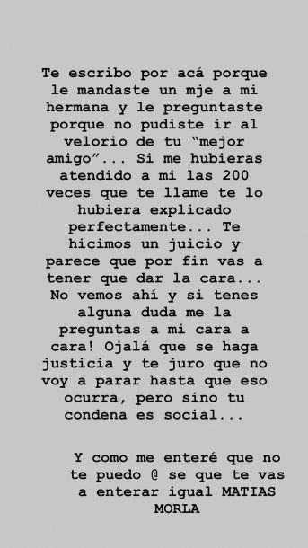 "Le mandaste un mensaje a mi hermana y le preguntaste por qué no pudiste ir al velorio de tu mejor amigo. Si me hubieras atendido a mí las 200 veces que te llamé te lo hubiera explicado perfectamente. Te hicimos un juicio y parece que por fin vas a tener que dar la cara", escribió. Y como no pudo arrobarlo, agregó: "Más cagón no se consigue".