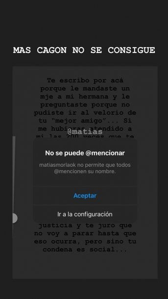 "Nos vemos ahí y si tenés alguna duda me la preguntás a mí cara a cara. Ojalá que se haya justicia, te juro que no voy a parar hasta que eso ocurra. Y si no, tu condena es social. Como me enteré que no te puedo arrobar, sé que te vas a enterar igual Matías Morla", continuó.