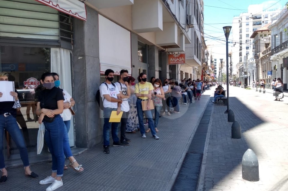 Durante toda la mañana, en la peatonal santafesina se vio una postal que revela una de las caras más crueles de la pandemia: la de la necesidad de trabajo. Cientos de personas hicieron cola, pese a la agobiante jornada, para entregar sus currículums en un local donde próximamente abrirá una panadería y confitería, en San Martín y Suipacha.