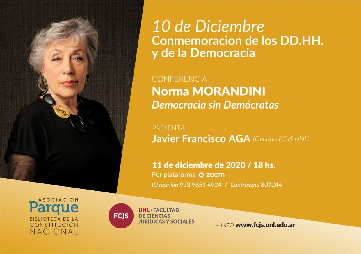 En el marco, de la Conmemoración de los Derechos Humanos y el Día de la Democracia, celebrados el 10 de diciembre, se realizará una conferencia a cargo de Norma Morandini, denominada "Democracia sin demócratas".