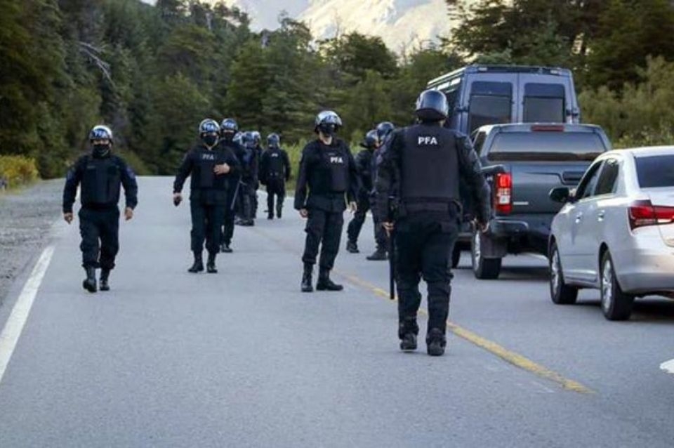 Alrededor de un centenar de efectivos arribaron al lugar junto a la fiscal federal Sylvia Little, que debe realizar una inspección ocular en el sector del predio de Parques Nacionales que fue vandalizado por miembros de la comunidad Lafken Winkul Mapu.