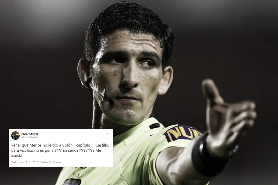 Esta vez le tocó a Colón. Con tan solo 4 minutos de juego no sancionó un penal clarísimo, una insólita falta a Bernardi cuando no estaba ni si quiera la pelota cerca. El experimentado Javier Castrilli, ex árbitro, se hizo eco de la actuación de Merlos en el encuentro. Mediante su cuenta de twitter mostró su enojo, no es la primera vez que se muestra en contra de sus arbitrajes.
