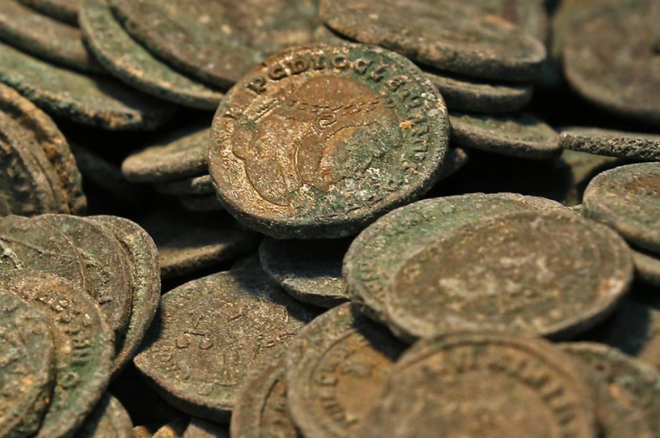 Curiosamente el hombre, cuya identidad no se ha dado a conocer, estaba desprovisto del detector de metales que acostumbra emplear y estaba observando un ave. Al limpiar el barro, el cazatesoros descubrió que era una moneda de oro de 2.000 años de antigüedad. Cuando halló la segunda pieza a un metro de distancia, regresó a su casa para recoger su detector de metales y horas después encontró 1.300 monedas que datan de los años 40-50 d.C.