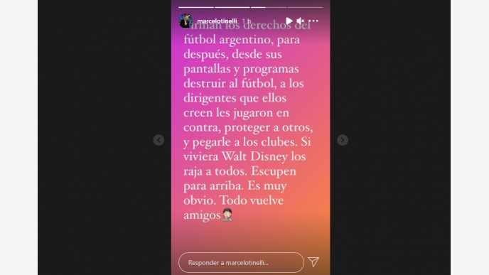 "Firman los derechos del fútbol argentino, para después, desde sus pantallas y programas destruir al fútbol, a los dirigentes que ellos creen les jugaron en contra, proteger a otros, y pegarles a los clubes", escribió Tinelli en una storie de Instagram.