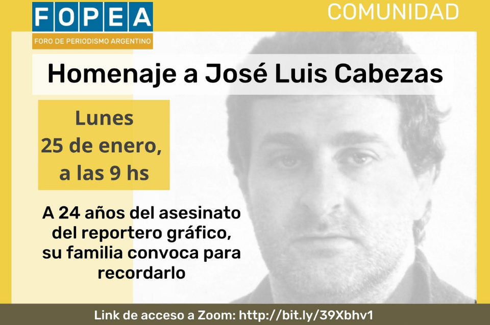 A 24 años del asesinato del reportero gráfico José Luis Cabezas. Gladys Cabezas, hermana de José Luis, convoca en nombre de la familia a un acto de homenaje que este año, debido a las medidas de prevención por la pandemia de COVID-19, se realizará a través de la plataforma Zoom el lunes 25 de enero a las 9 de la mañana. Los familiares han decido que este año el homenaje sea virtual. Es así que convocan a recordar y conmemorar el imborrable crimen e invitan a Ud. a participar de una reunión de zoom a realizarse el día 25 de enero de 2021 a las 9.00 AM hora Argentina. El estudio del letrado y apoderado de la familia, Dr. Alejandro Vecchi, oficiara las veces de coordinador general del evento vía web, para lo cual podrán dirigirse vía e-mail a av@alejandrovecchi.com o al mail homenaje.jlc@gmail.com