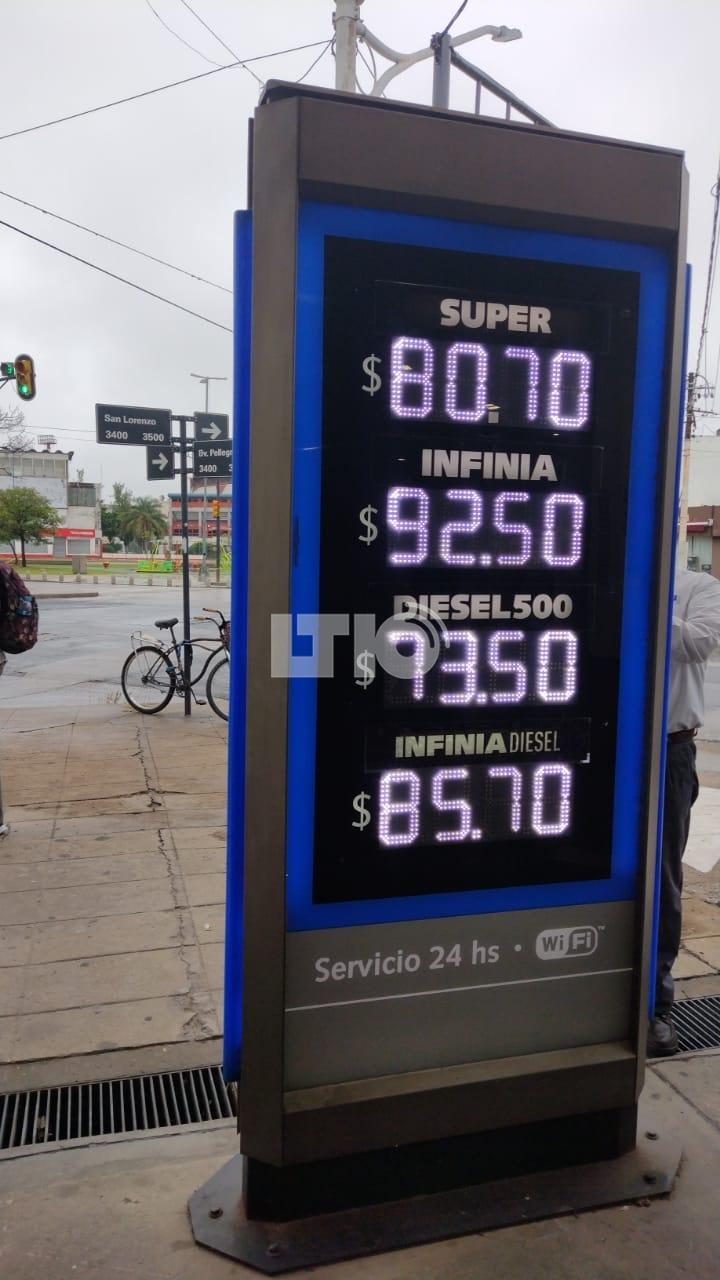 El Móvil de LT10 acudió a una de las sucursales de la empresa, donde pudo constatar que desde esta mañana, la nafta Infinia pasó a costar $92,50 , Super $80,70 , Diesel 500 $73,50, Infinia diesel $85,70, lo que se traduce en un aumento de entre un 2 y 3%.
