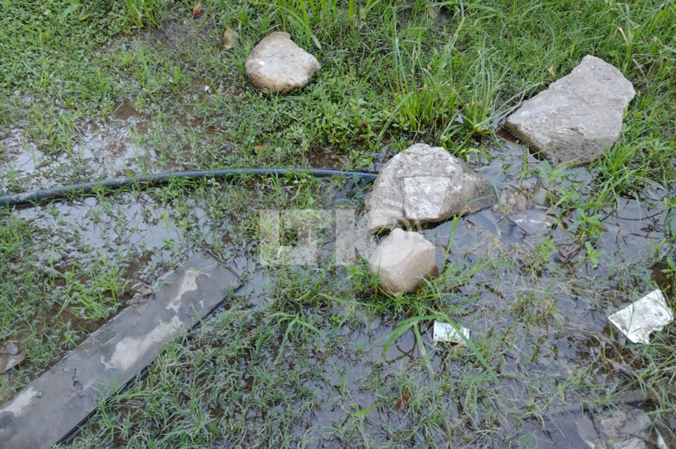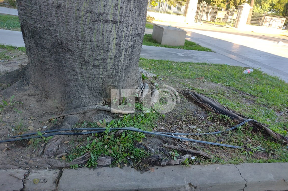 Por otro lado, en la intersección con calle Salta hay un caño roto que pertenece al sistema de riego.