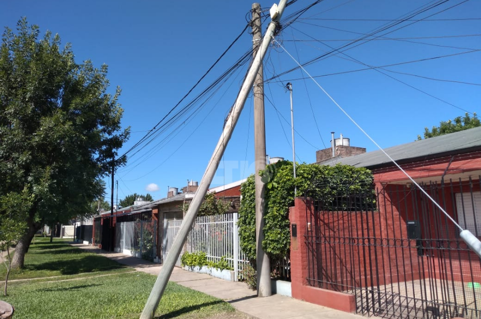 “La situación es un peligro, este poste está hace dos meses así, puede electrocutar las casas, es un peligro, acá hay chicos” dijo un vecino al Móvil de LT10. Se trata de un poste de telefonía que está caído y se sostiene sobre unos cables de electricidad.