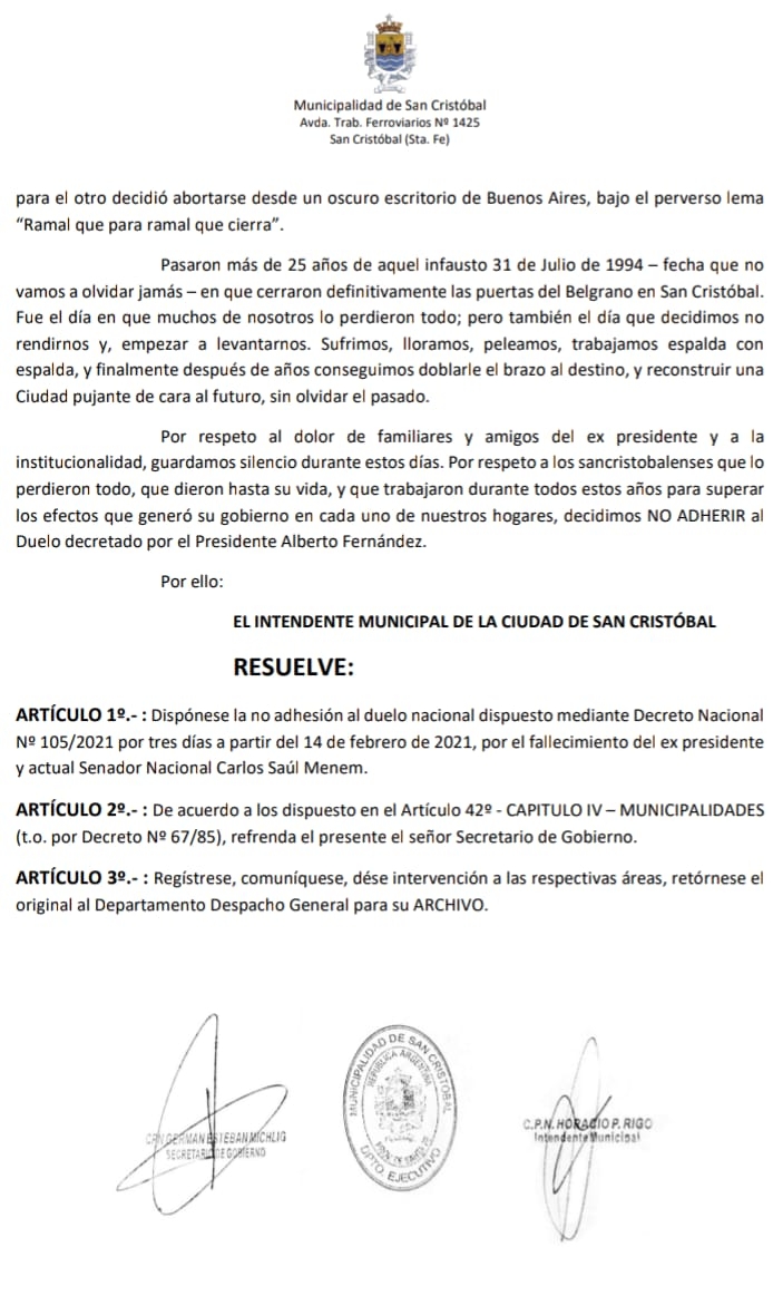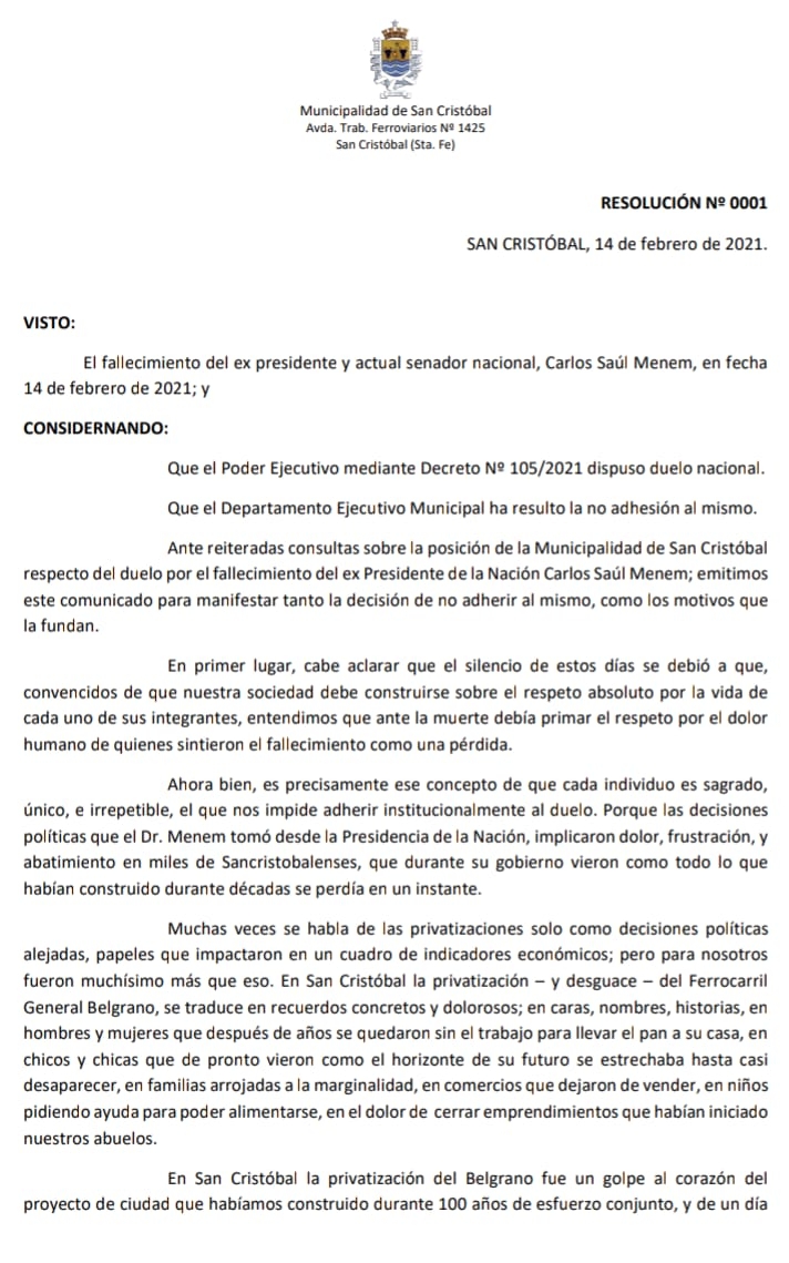 Es por eso que desde el Municipio y a través de un comunicado indicaron la decisión de no adherir al decreto nacional Nº 105/2021 que dispuso Duelo Nacional por el fallecimiento del ex presidente.