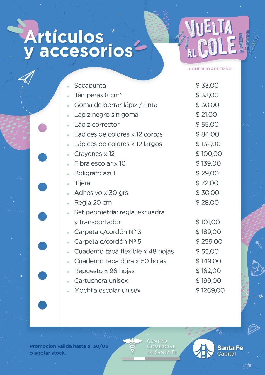 Esta iniciativa, que ya se realizó el año pasado con resultados positivos para el sector, se retoma en 14 comercios de la ciudad y contempla una lista de 21 artículos escolares, entre los que figuran lápices, sacapuntas, cuadernos, cartucheras, mochilas, entre otros. Los santafesinos tendrán la posibilidad de acceder a estos precios acordados hasta el 31 de marzo.