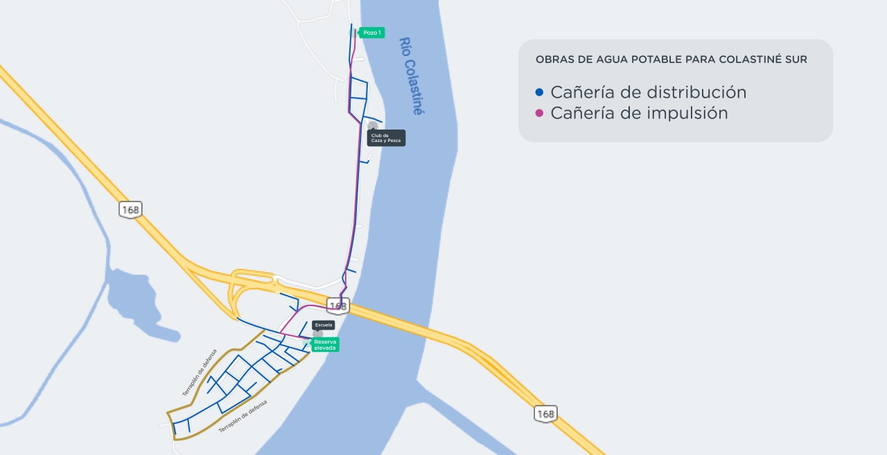 Una vez que se extraiga el agua de la perforación, la misma es impulsada hacia la reserva elevada a través de una cañería de 1.930 metros con las correspondientes cámaras de aire y desagüe, cámara de bombeo, tablero y plataforma de operación y control.