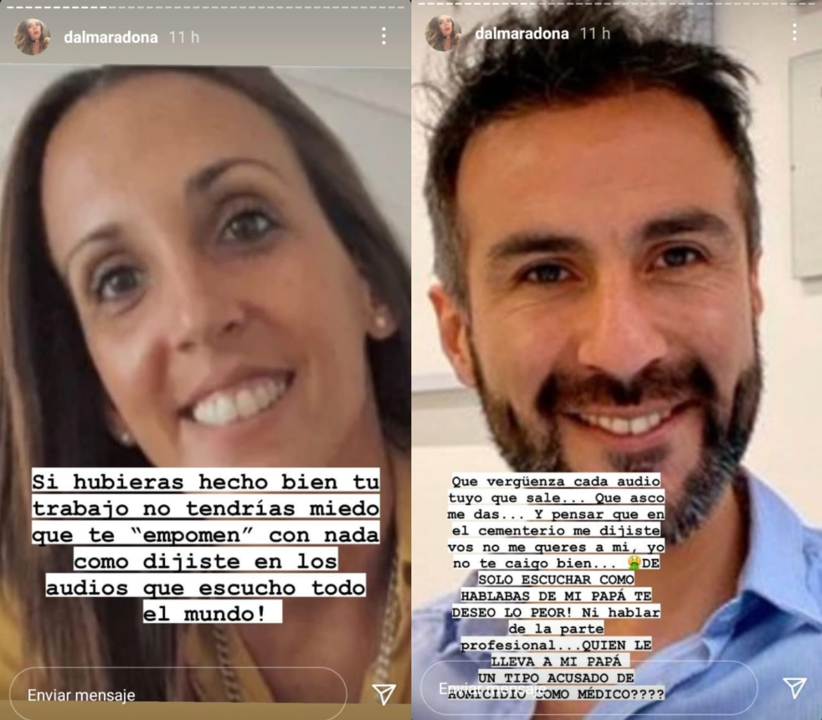 A través de Instagram Stories, Dalma publicó fotos de cada uno de ellos junto a contundentes críticas. Los atacó, habló sobre sus funciones respecto a la salud del astro, detalló los motivos por los que ella cree que deberían ir presos y luego respondió preguntas de sus seguidores.
