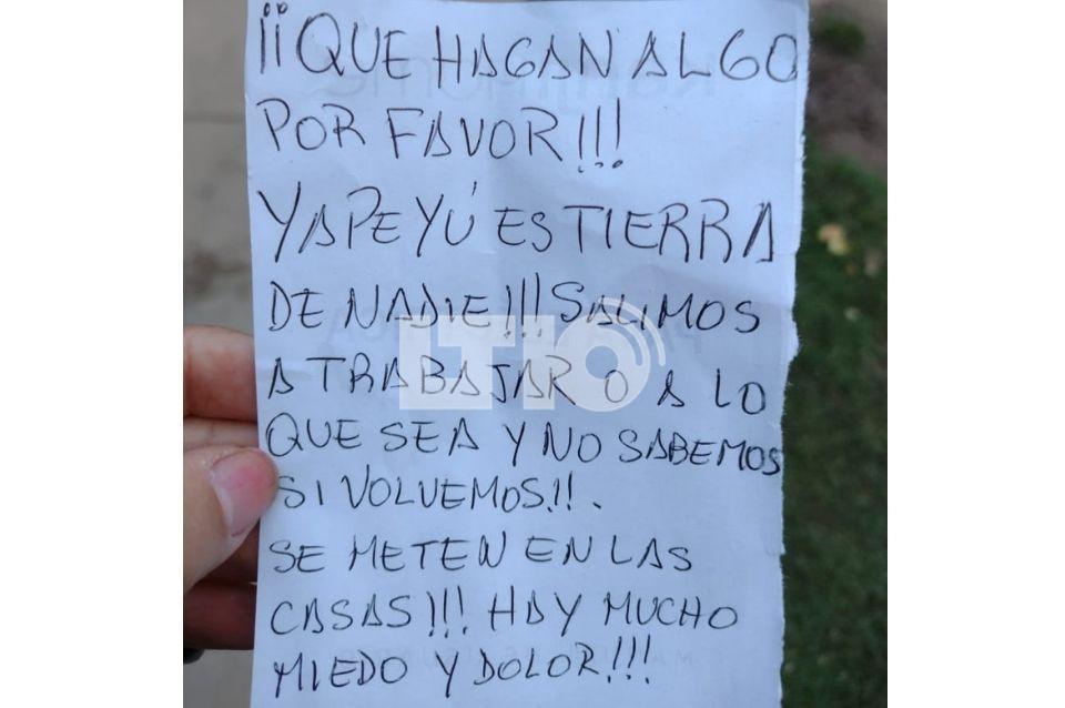 En un pedacito de papel, el vecino escribió: “Que hagan algo por favor. Yapeyú es tierra de nadie. Salimos a trabajar o a lo que sea, y no sabemos si volvemos. Hay mucho miedo y dolor”.