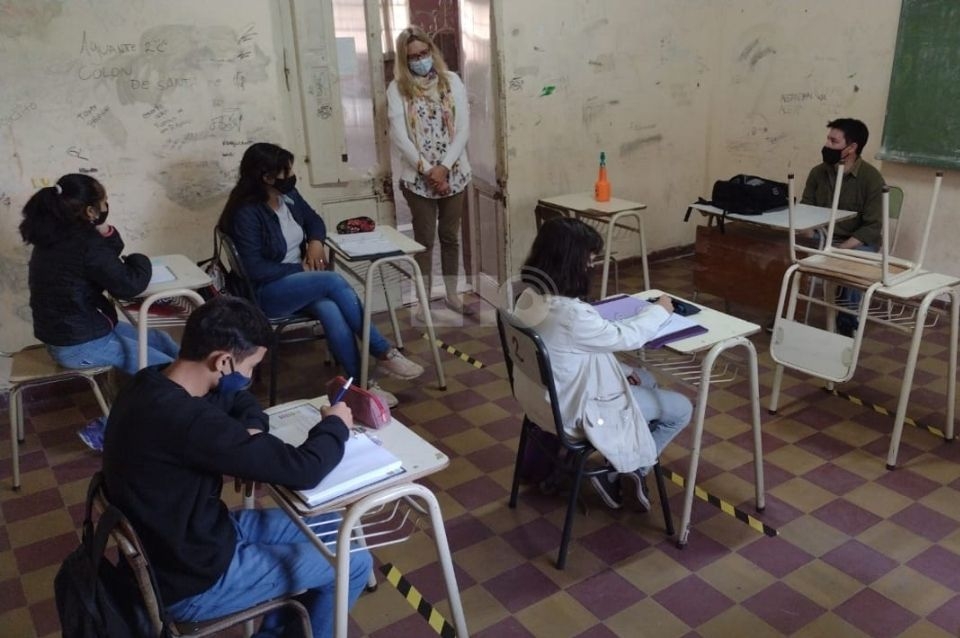“Hoy estamos con los chicos de 1er año en el turno mañana, mañana con los 2dos y terceros, y el viernes con los 4tos y 5tos años” explicó la docente que destacó la labor de todo el recurso humano que tiene la institución. Además. Detalló que como pide el protocolo, hay 1.5 metros entre alumnos y con el profesor, las aulas están ventiladas, todos con barbijos y la aplicación constante de alcohol en gel.