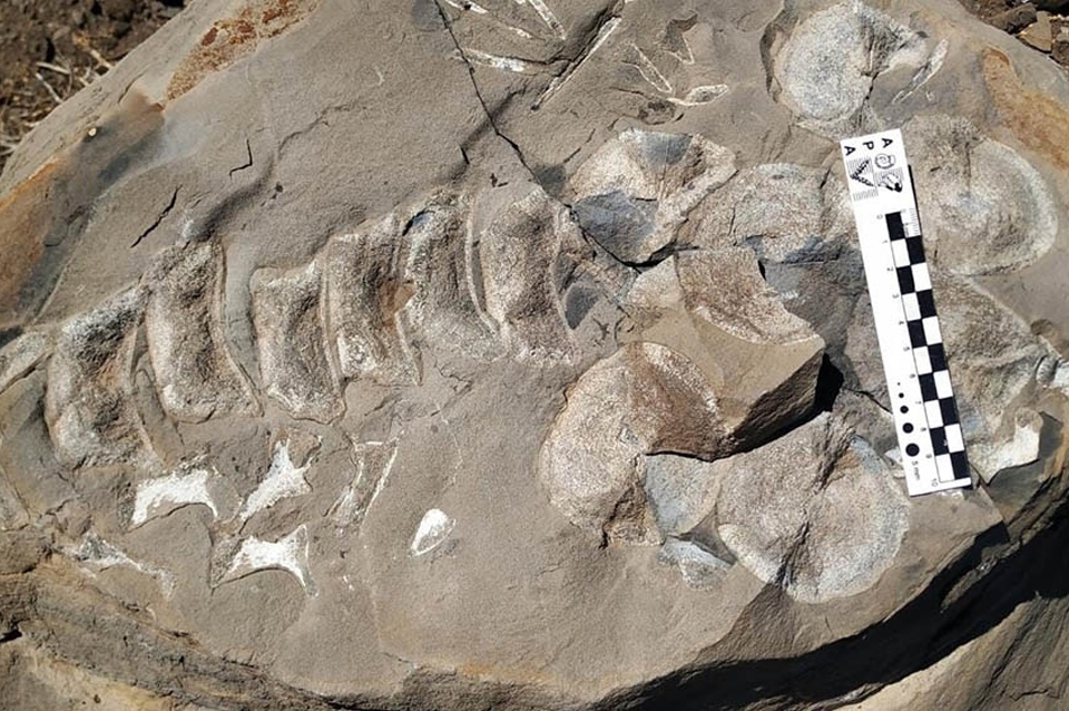 Un equipo de investigadores de la Dirección de Patrimonio Cultural realizó el rescate de fósiles de un reptil marino del grupo de los ictiosaurios compuesto por una serie articulada de vértebras, arcos neurales y costillas.