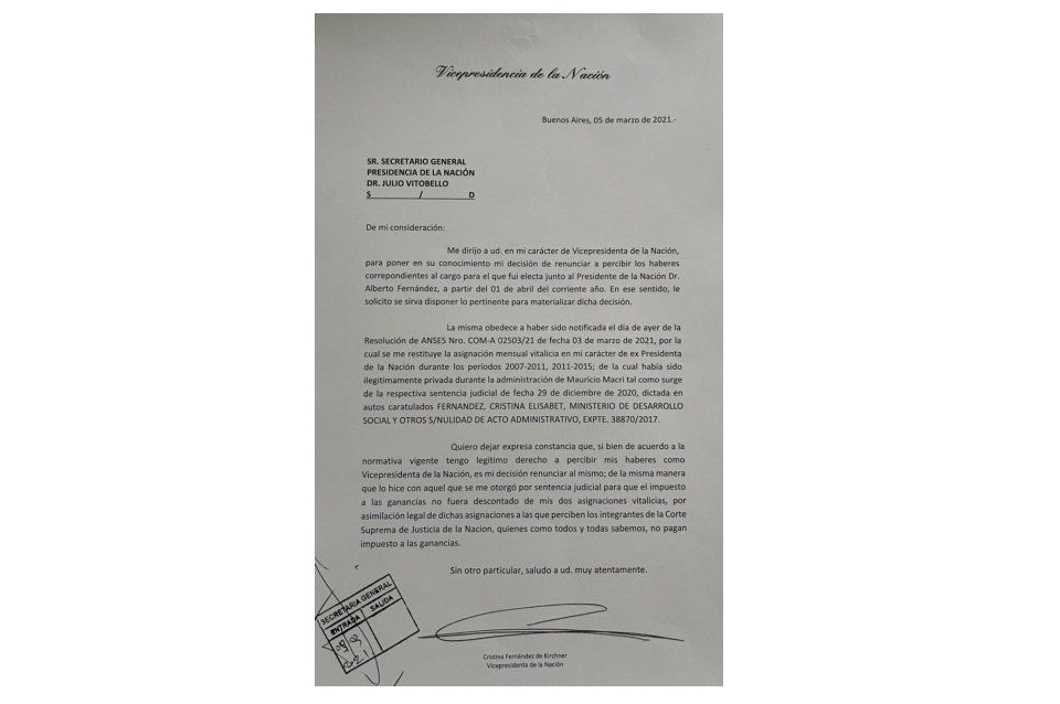 “Me dirijo a usted en mi carácter de Vicepresidenta de la Nación, para poner en su conocimiento mi decisión de renunciar a percibir los haberes correspondientes al cargo para el que fui electa junto al Presidente de la Nación Dr. Alberto Fernández, a partir del 01 de abril del corriente año. En ese sentido, le solicito se sirva disponer lo pertinente para materializar dicha decisión” dice la ex mandataria en la misiva.