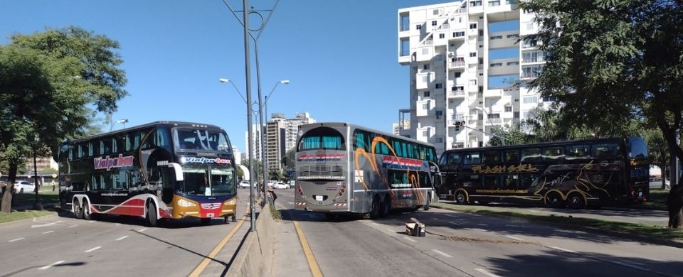 Alrededor de 15 empresas de transporte turístico están bloqueando por segundo día consecutivo la terminal de ómnibus en Santa Fe. Minutos después de las 10:00, dos colectivos cortaron por completo ambas manos de Avenida Alem, a la altura de Belgrano.