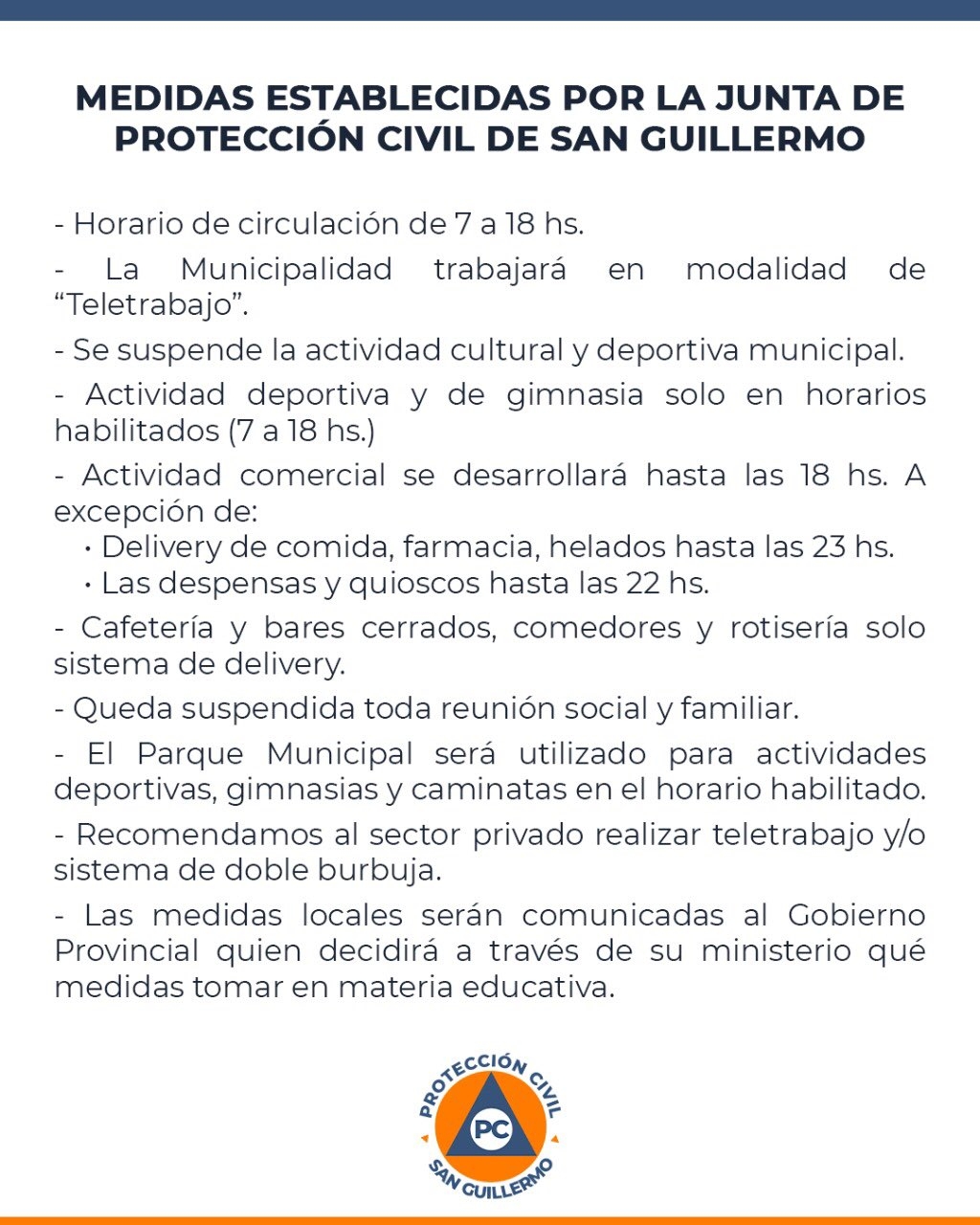 Además, la Municipalidad trabajará en modalidad de teletrabajo; se suspende la actividad cultural y deportiva municipal; actividad deportiva y de gimnasio solo en los horarios habilitados (de 7 a 18); actividad comercial hasta las 18 hs, a excepción de: delivery de comida y farmacia, helados hasta las 23 hs; despensas y quiscos hasta las 22 hs; cafetería y bares cerrados, comedores y rotiserías solo sistema delivery; queda suspendida toda reunión social y familiar; el Parque municipal será utilizado para actividades deportivas, gimnasias y caminatas en horarios habilitados; recomendamos al sector privado realizar teletrabajo y/o sistema de doble burbuja.