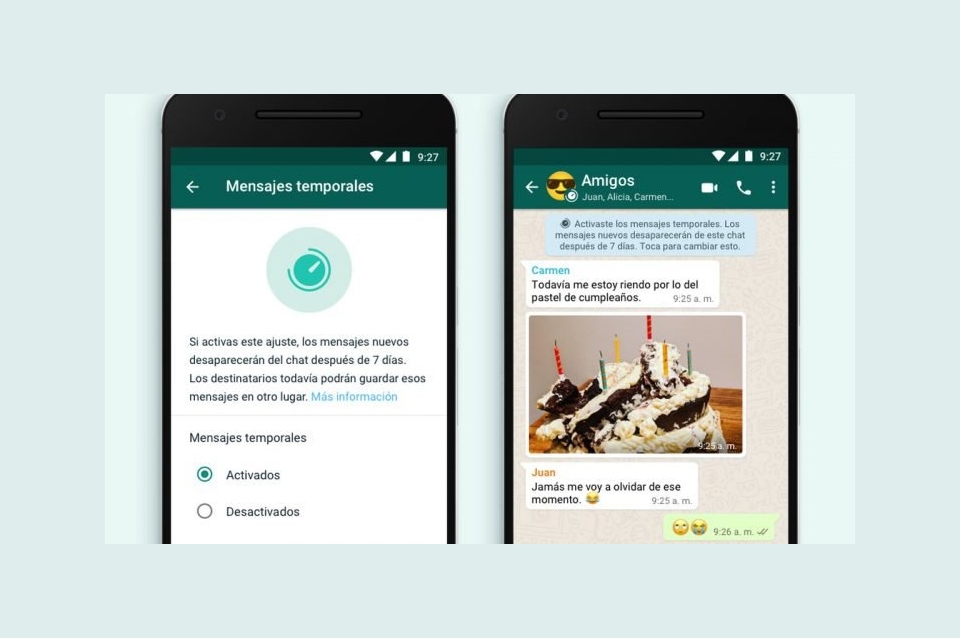 La plataforma de mensajería WhatsApp posee una función para mensajes temporales o “mensajes que se autoeliminan” a los 7 días tanto para chats individuales como grupales. Sin embargo, en este último solo está habilitado para el administrador del mismo y es quien debe permitir la función para el resto de los usuarios.