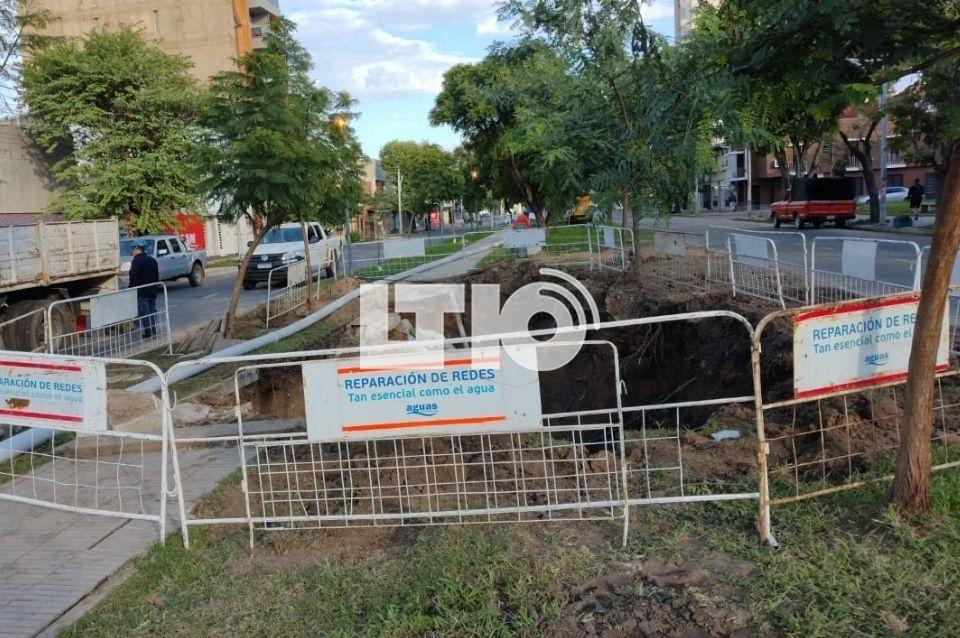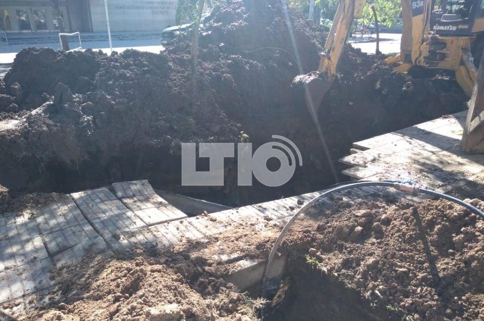 Según explicó el vocero de ASSA, por la rotura de una cañería cloacal domiciliaria se produjo un hundimiento en el cantero central de boulevard, frente al ministerio de la Producción.