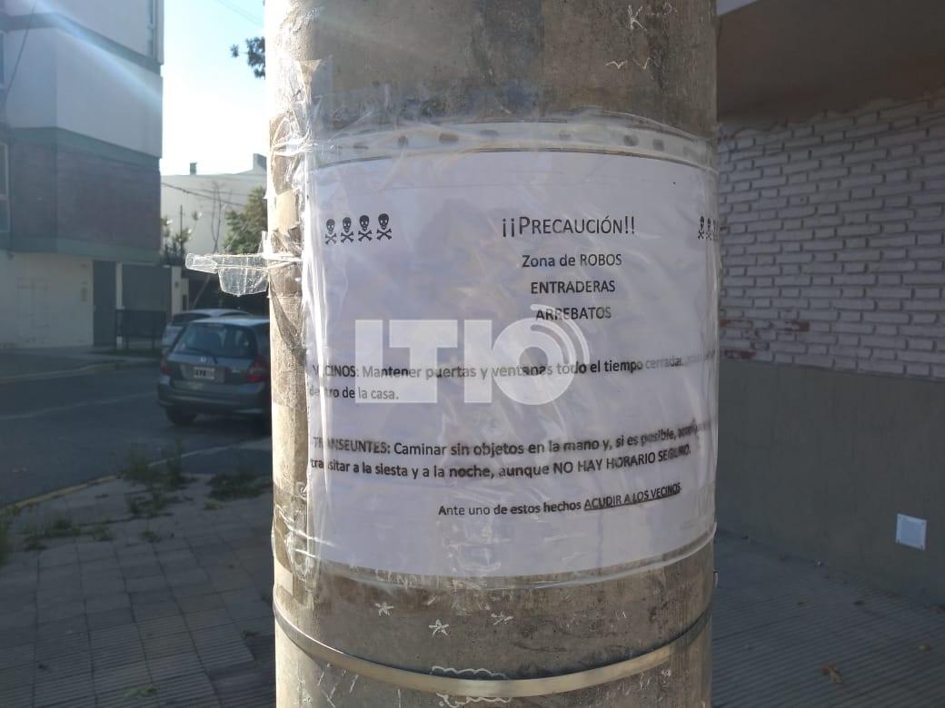 Según pudo observar el móvil de LT10, en la cuadra de Maipú y Chacabuco, entre Mitre y Alberdi los habitantes del barrio dejaron mensajes en los postes de luz y los árboles: “Precaución: zona de robos, entraderas, arrebatos”, se puede leer en el papel, que además deja recomendaciones para vecinos y transeúntes sobre los hechos de inseguridad que ocurren a toda hora.