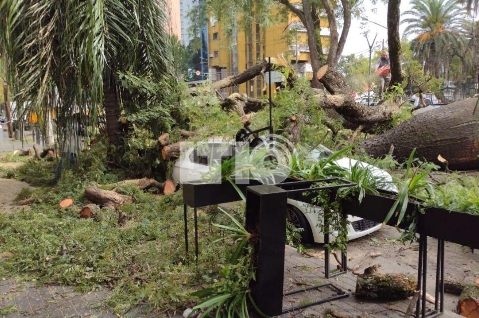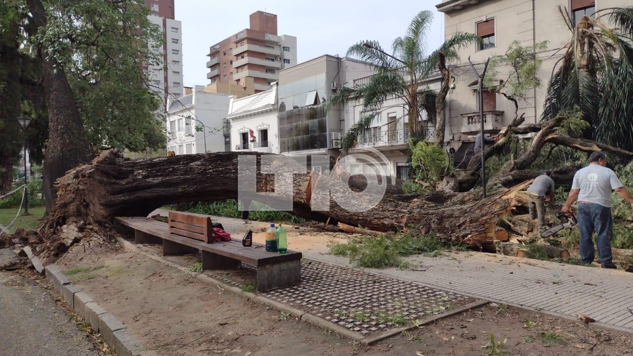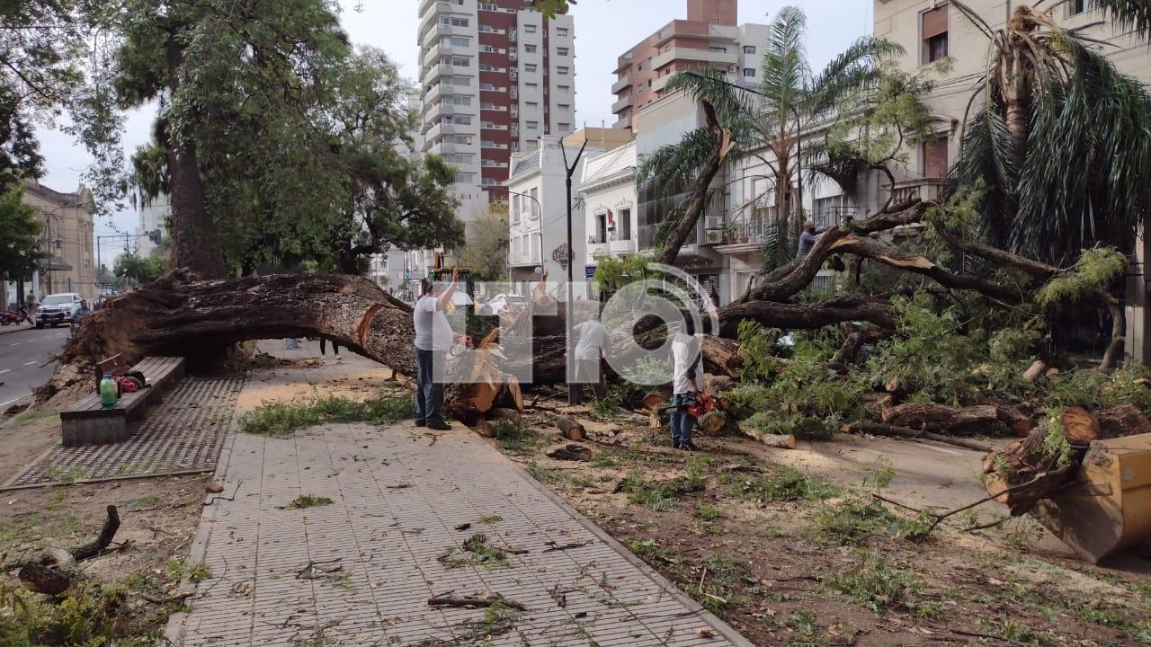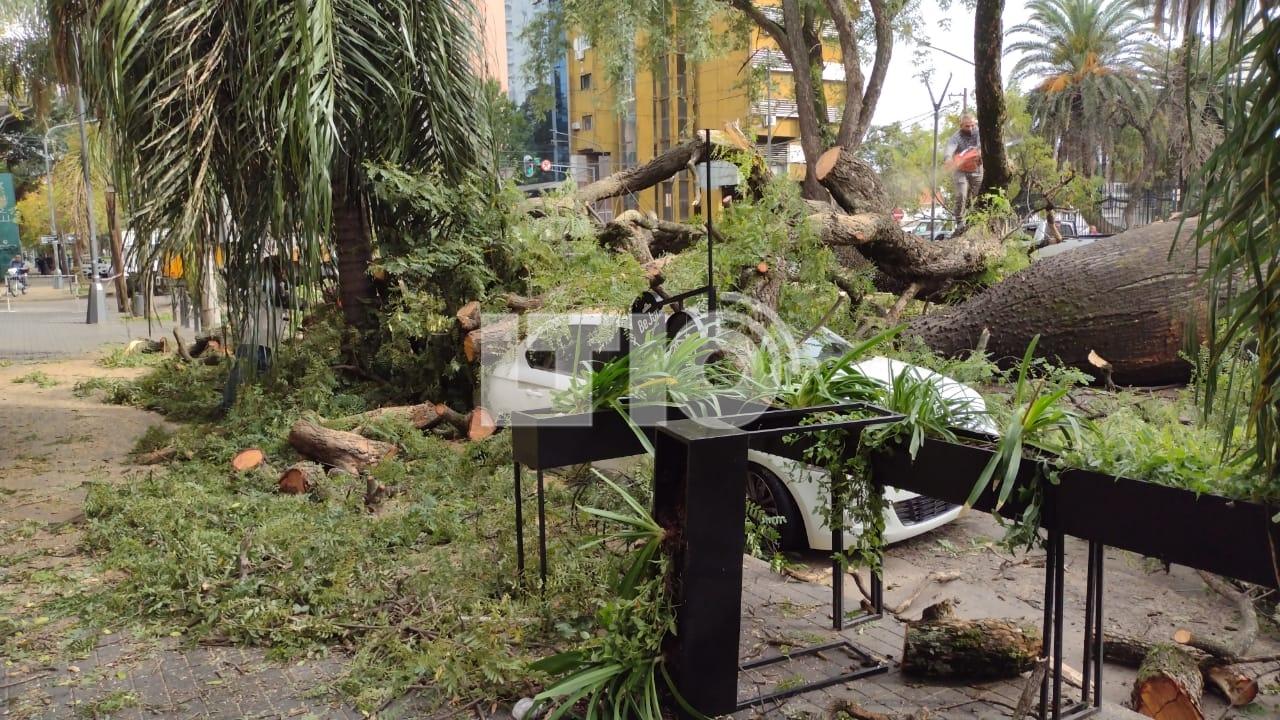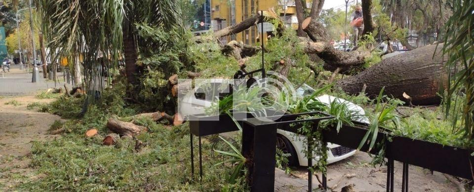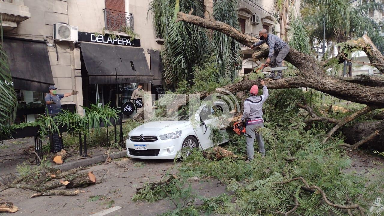 En el caso de lo sucedido en Boulevard y Güemes, uno de los árboles que se encuentran en el cantero central cayó y destrozó por completo un auto que estaba estacionado en la mano hacia la costanera.