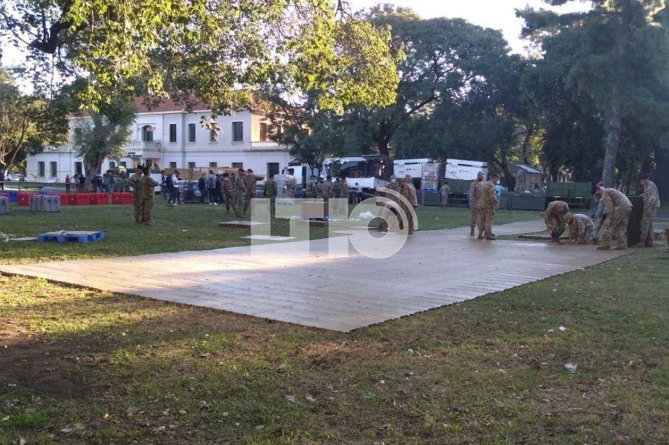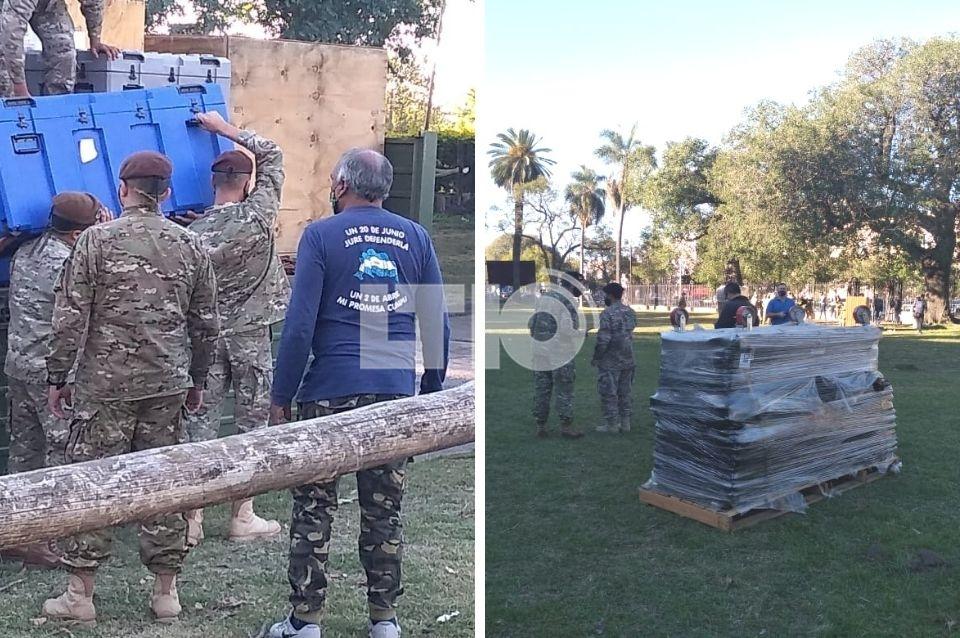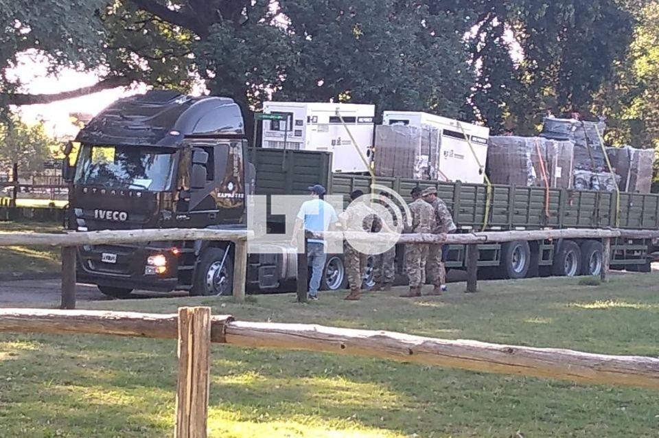 Cerca de las 16 arribaron los dos camiones del Ejército que transportaban toda la estructura para instalar la base sanitaria. Los vehículos ingresaron al Liceo Militar para proceder a la descarga de los elementos y comenzar el armado del hospital reubicable que está previsto que lleve menos de 48 horas.