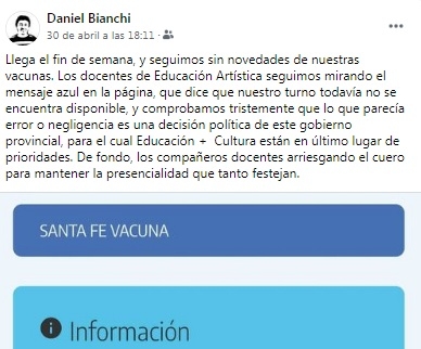 También, LT10 recibió reclamos de docentes de la Escuela de Educación Secundaria Orientada Particular Incorporada N° 8.245 “Nuestra señora de Guadalupe” (que está en el puerto de Santa Fe) que tampoco recibieron la primera dosis y están sosteniendo la presencialidad.