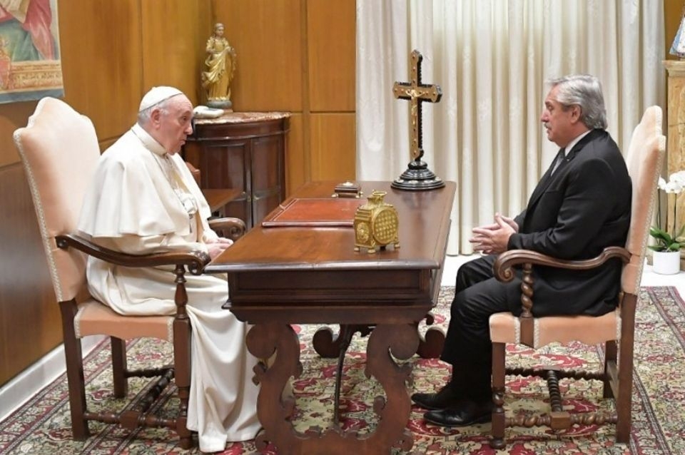 El presidente Alberto Fernández compartió un encuentro privado con el Papa Francisco en el Estudio privado del Aula Paulo VI del Palacio del Santo Oficio, en Ciudad del Vaticano.