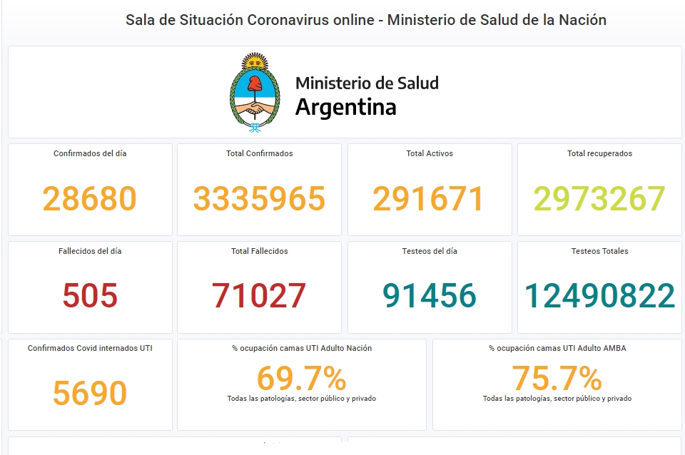 Además, el Ministerio de Salud confirmó que otras 505 personas perdieron la vida por coronavirus en Argentina en las últimas 24 horas. El total acumulado de fallecidos hasta la fecha es de 71.027.