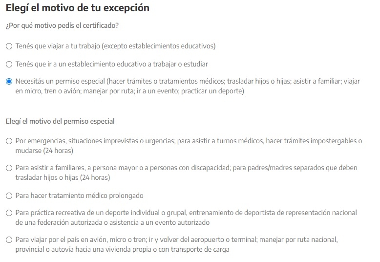 Otra opción se da en este link, donde antes se podía pedir permiso para varias actividades como salidas laborales o sociales. Varias de ellas aún siguen vigentes como la opción de la habilitación para ir a Bares y restaurantes, Trabajador esencial, Trabajador actividad no esencial y Trabajador gastronómico.